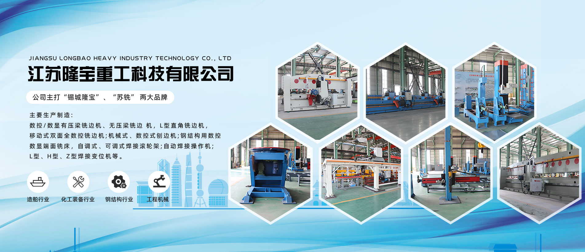 公司主打“錫城隆寶”、“蘇銑” 兩大品牌,主要生產制造:數控/數顯有壓梁銑邊機、無壓梁銑邊 機,L型直角銑邊機,移動式雙面全數控銑邊機;機械式、數控式刨邊機 ;鋼結構用數控/數顯端面銑床,自 調式、可調式焊接滾輪架;自動焊接操作機; L型、H型、Z型焊接變位機;管法蘭變位機;管子坡口機等一系列自動焊接裝備。